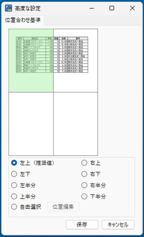 また、[高度な設定]ダイアログの[自由選択]をクリックし、[位置編集]を押下すると、[位置編集]ダイアログが開きます。