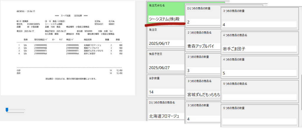 帳票の説明と発注元会社名の指示文に追記し、AIが判断するための情報を与えてやります。