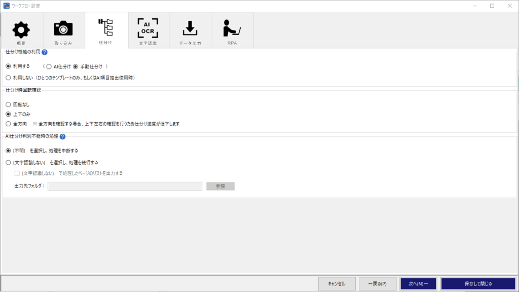 仕分け時回転設定は「回転なし」「上下のみ」「全方向」の3つがあります。