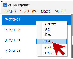 ワークフローを右クリックで選択してコンテキスト メニュー(ショートカット メニュー)を表示した後、[削除]をクリックしてください。