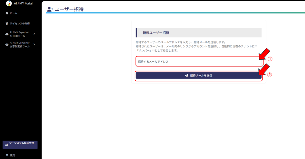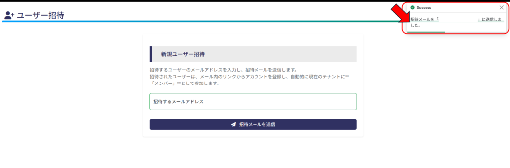 下図、赤枠部のような画面がでていれば招待メールが送信できています。